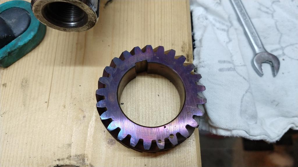 Nockenwellenantriebsrad auf die Herdplatte.....ca. 3-5 min ... vergeblich versucht das draufzubekommen.....neuer Versuch - Kanten an der Nut etwas mit der Schlüsselfeile gebrochen....hatte aber vergessen zwischenzeitlich die Herdplatte auszuschalten....Nockenwellenrad auf die (wohl viel zu heiße) Herdplatte gelegt und......natürlich....nach zwei Minuten die tollsten Anlassfarben.....Zahnrad Schrott....