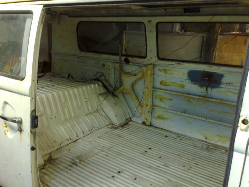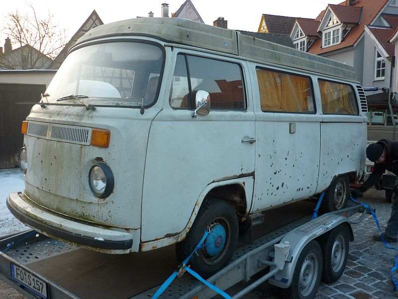 Endlich ist es soweit, der Bus steht seit Freitag bei uns in der Garage. Da der Vorbesitzer den Brief verlegte, hat sich das noch etwas hingezogen. Als erstes wurde Samstag Nachmittag der Bus innen geräumt. Ging ziemlich schnell und die Einrichtung wurde bis zur Wiederaufarbeitung im Dachboden verstaut. Die ersten Versuche denn Motor zu starten waren kläglich. Erst hing der Anlasser, der mit mittelschweren Schlägen zur Arbeit gezwungen werden musste, danach war die Stromversorgung einfach zu schwach. Er sprang zwar mal kurz an, gesund hörte er sich aber nicht an